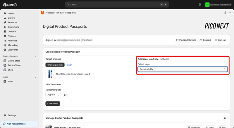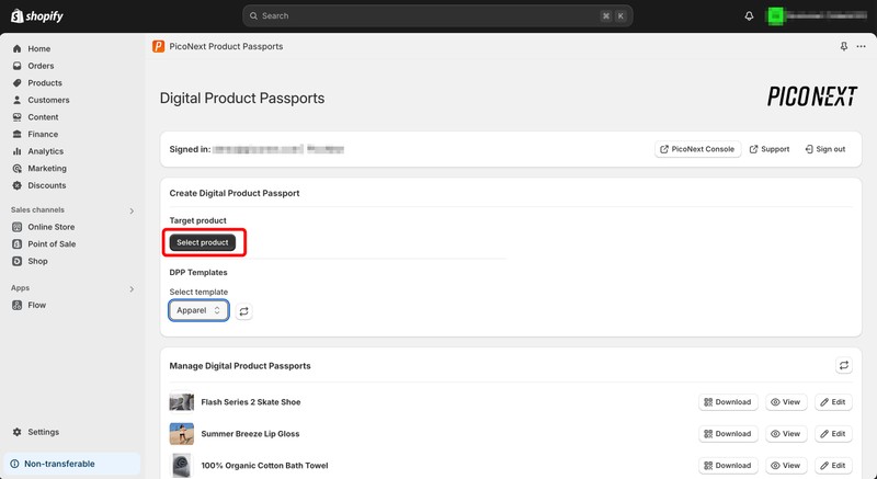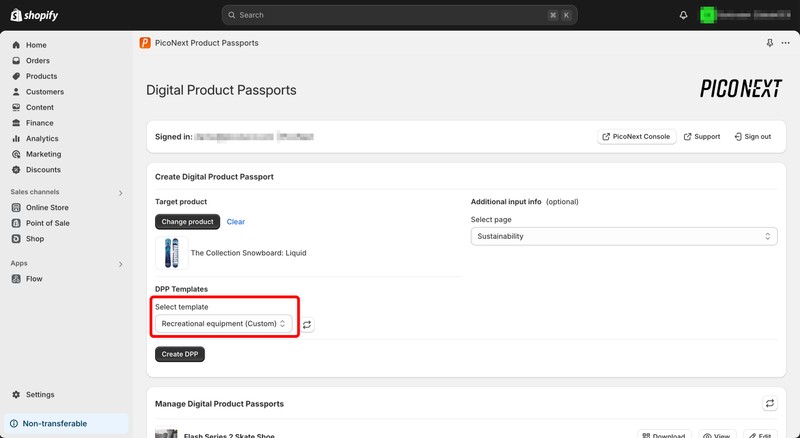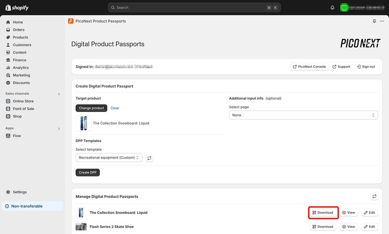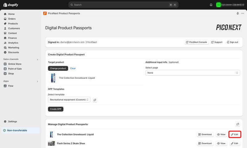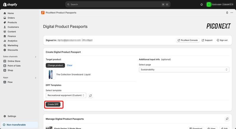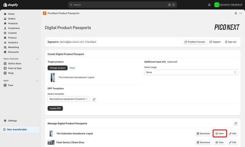 In the Manage Digital Product Passports section of the Shopify app, you’ll see a list of all DPPs that have been created in your account. These include DPPs you’ve created using the Shopify app, as well as DPPs you’ve created in the PicoNext Console.