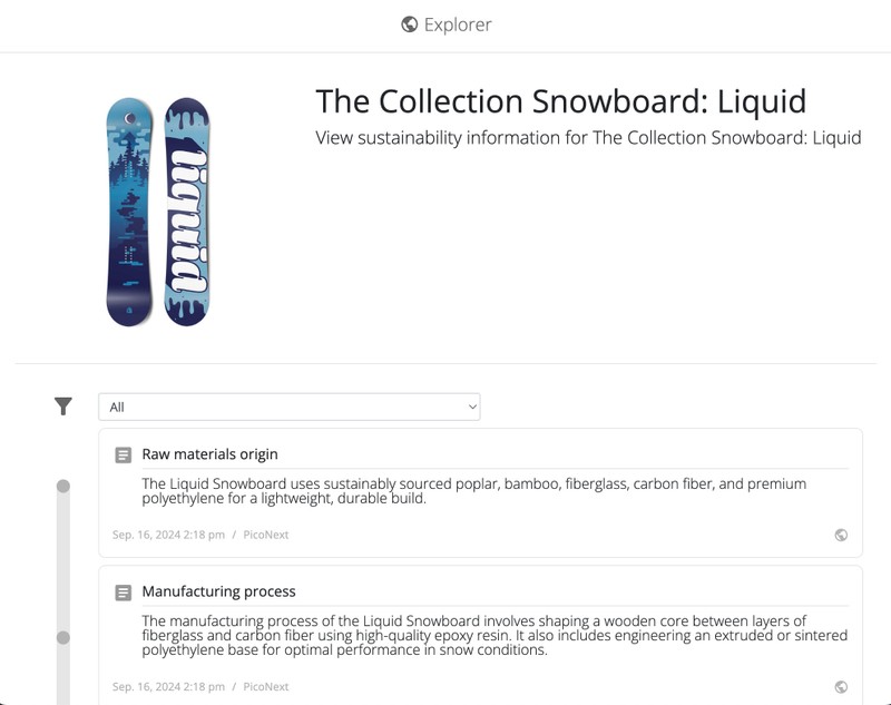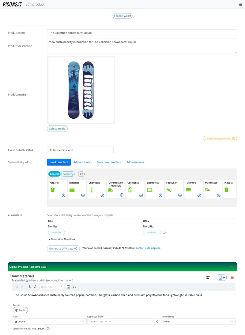 Templates in PicoNext contain sustainability attributes about your product – including attributes like raw material sourcing, environmental impacts, recyclability, and disposal information.