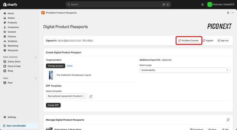 1. Press the PicoNext Console button in the Shopify app