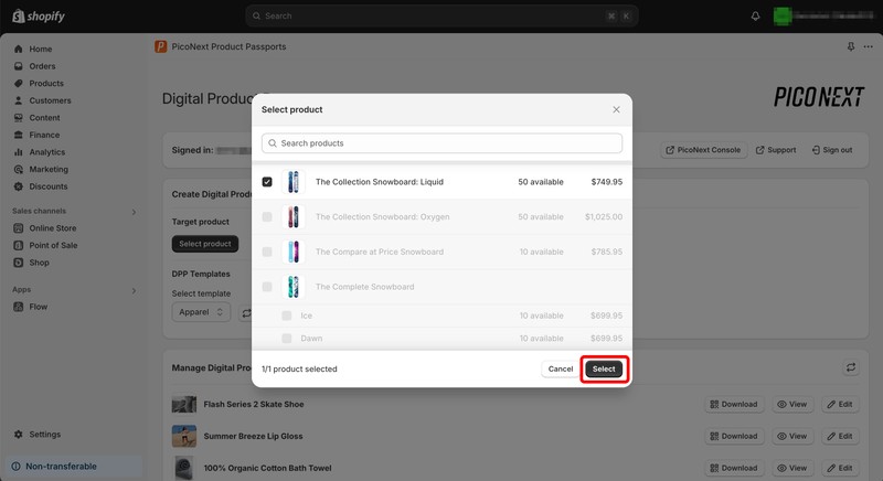 1. Press the Select Product button to choose a product for which you’d like to create a DPP.