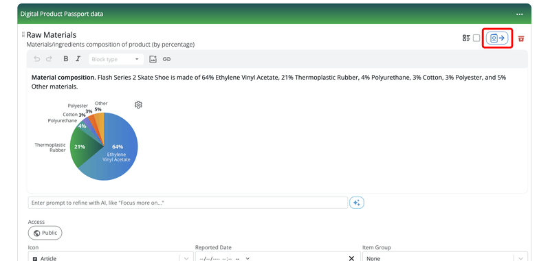 To send one data field from your DPP Planner product to DPP Data Events, press on the Send button in the individual data field. This will copy the information from the individual DPP Planner product data field to the DPP Data Events page, after which you will be able to associate that DPP Data Event with your blockchain token.