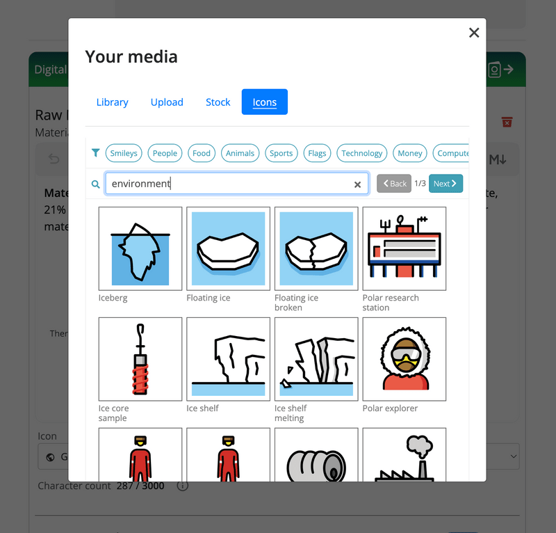 1. Search for an icon by entering a keyword in the search field. Alternatively, browse for an icon using the categories above the search box.