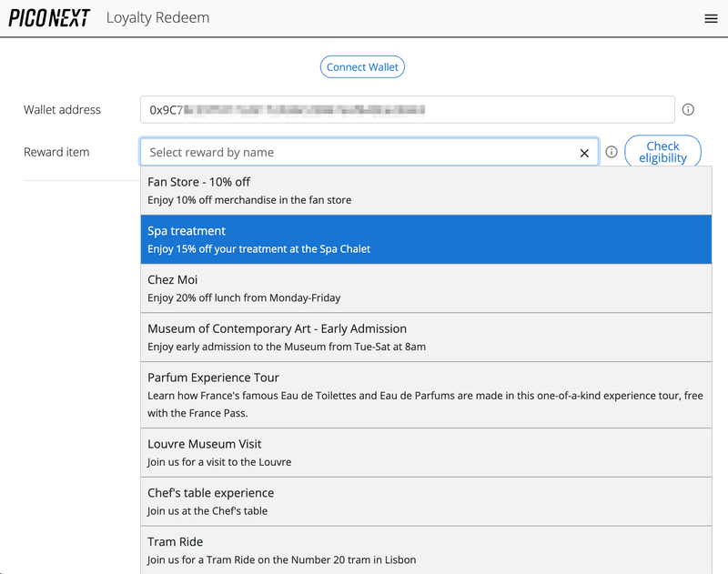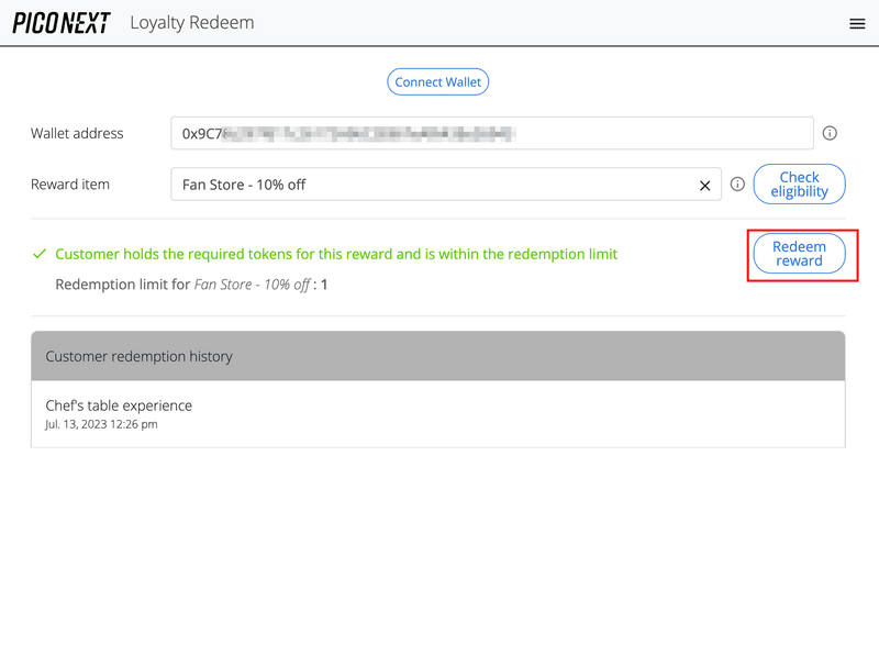 You can redeem loyalty rewards manually for your customers via a system admin console. To do so, you'll need the customer's wallet address and the reward name they're redeeming.