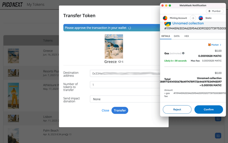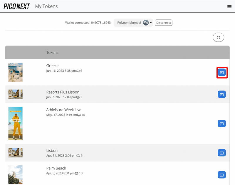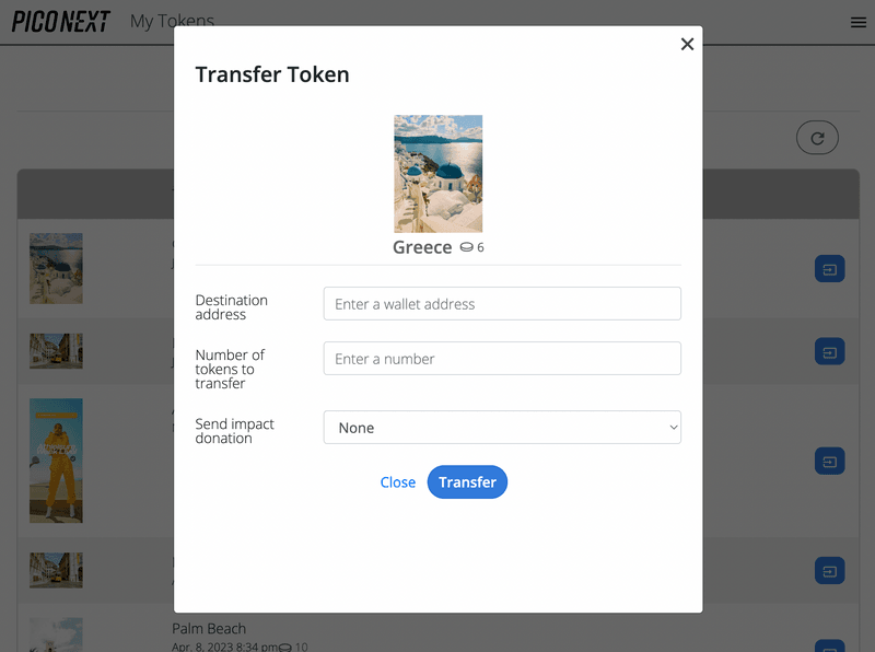 PicoNext enables you to quickly transfer a blockchain-based token to a different wallet address from within the Console. To send a blockchain-based token to an address, follow the steps below.