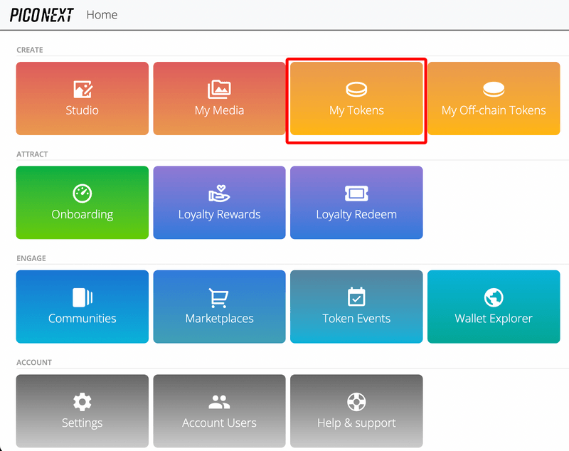 1A - Navigate to My Tokens. Use the Home Screen or the dropdown menu in the upper right-hand corner of the Console to navigate to the My Tokens page.