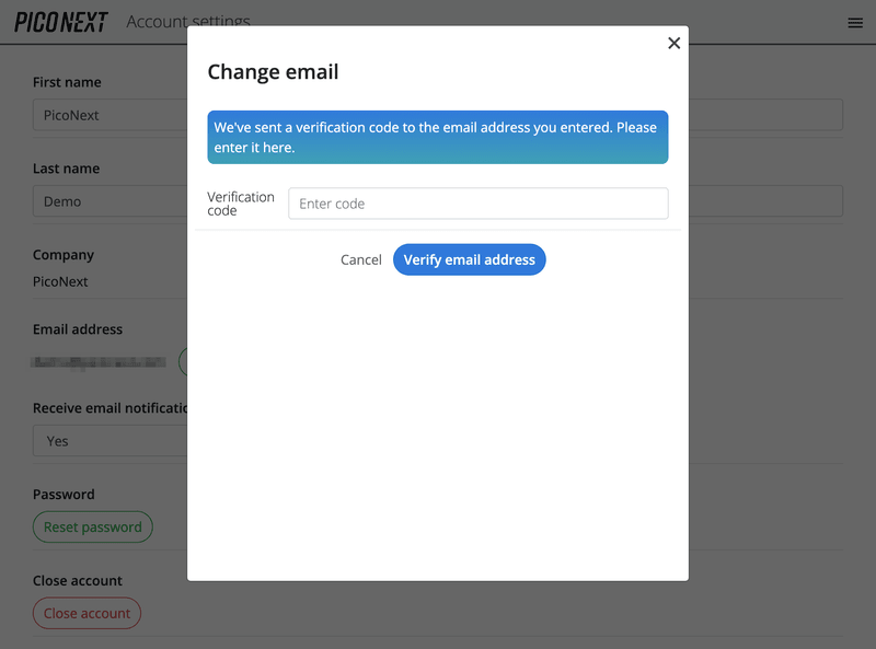 To change your email address, press the Update email button, enter your updated email address, and press Next. You'll be sent a confirmation code to the updated email address. Then, to confirm your email, enter that confirmation code and press Save. If you don't confirm your email by entering a confirmation code, you may not be able to receive notifications correctly from PicoNext.